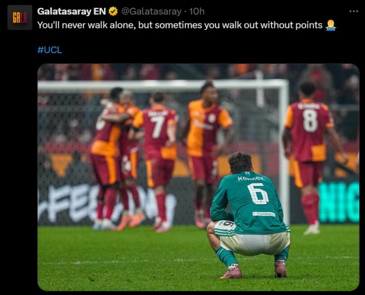 欧冠联赛阶段第二轮,利物浦去客场踢球,结果0比1输给了加拉塔萨雷。赛后,加拉塔萨雷在社交媒体上玩了个梗,模仿利物浦的经典队歌,写道:“你永远不会独行,但有时候嘛,你可能啥都捞不着”。利物浦在欧冠联赛阶段第二轮去客场踢球,0-1输给了加拉塔萨雷。比赛一结束,加拉塔萨雷俱乐部就在社交媒体上开始“搞事情”了,先发了一条调侃的:“你们在伊斯坦布尔的唯一奇迹,还是2005年那会儿的事儿”。接着,又模仿利物浦